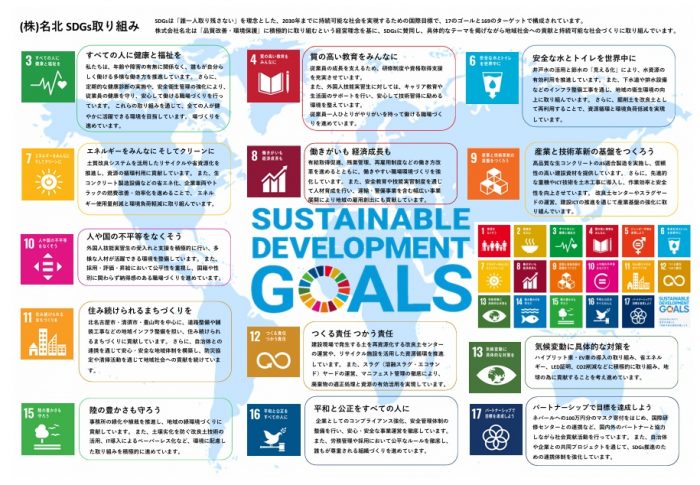 SDGs株式会社名北では、「品質第一・環境保全」を基本理念に、SDGs(持続可能な開発目標)への取り組みを進めています。このたび、社会環境の変化や日々の現場での...続きを読む