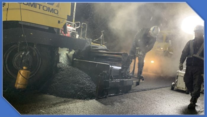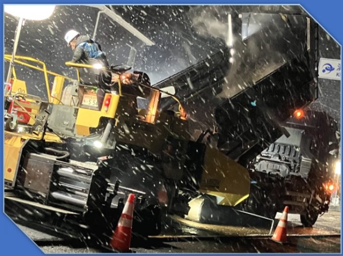 夜間工事ならではの照明に照らされた舗装作業は迫力があり、現場の緊張感や一体感が伝わってきます。